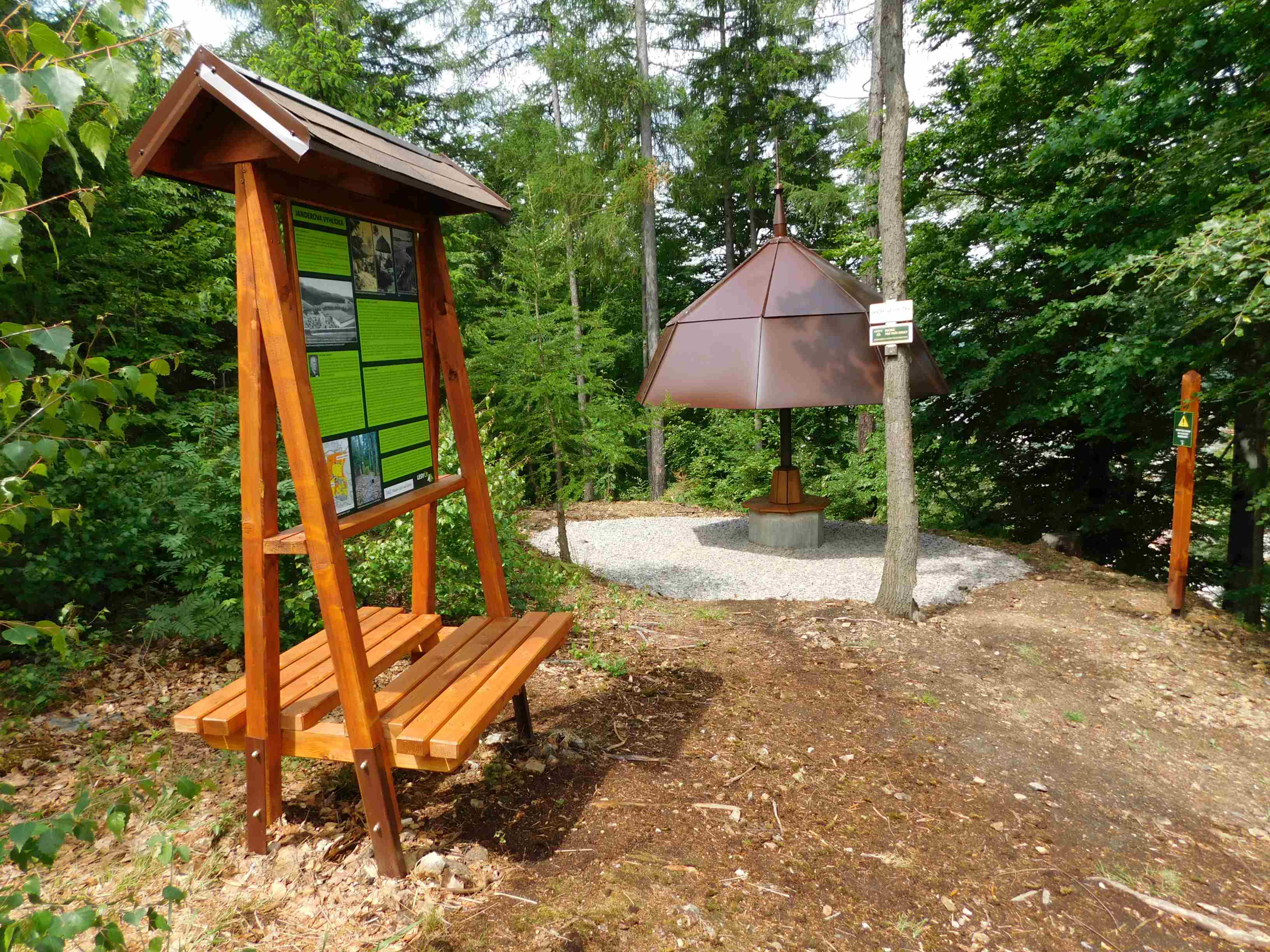 Obnovu Janderovy vyhlídky v lesích nad Kerharticemi, místní částí Ústí nad Orlicí, právě dokončily Lesy České republiky. Oblíbené výletní místo „Oušťáků“ tak zase využívá veřejnost. Dnešnímu turistickému přístřešku vrátily Lesy ČR podobu historického paraplete vybudovaného tamějším okrašlovacím spolkem v roce 1928, nedaleko instalovaly dřevěné posezení a ohniště. „Při obnově přístřešku jsme vycházeli z dokumentace městského muzea. O historii místa se lidé dočtou na nové info tabuli,“ řekla lanškrounská lesní správkyně z Lesů ČR Jana Trejtnarová. Státní podnik projekt za 128 tisíc korun financoval z vlastního programu Lesy pro život, díky němuž vznikají nebo se obnovují v lesích stovky větších či menších staveb, odpočívadel, přístřešků, ale i tůní a studánek.